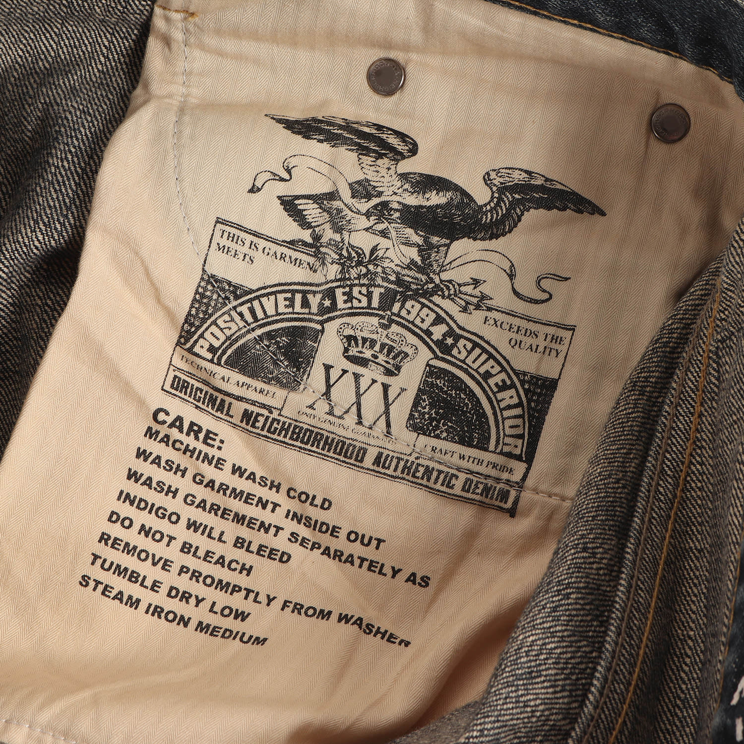 | サイズ備考 | ウエスト約86cm(平置き)×股上約34cm×股下約73cm×ワタリ幅約33cm(もも幅)×裾幅約21cm |