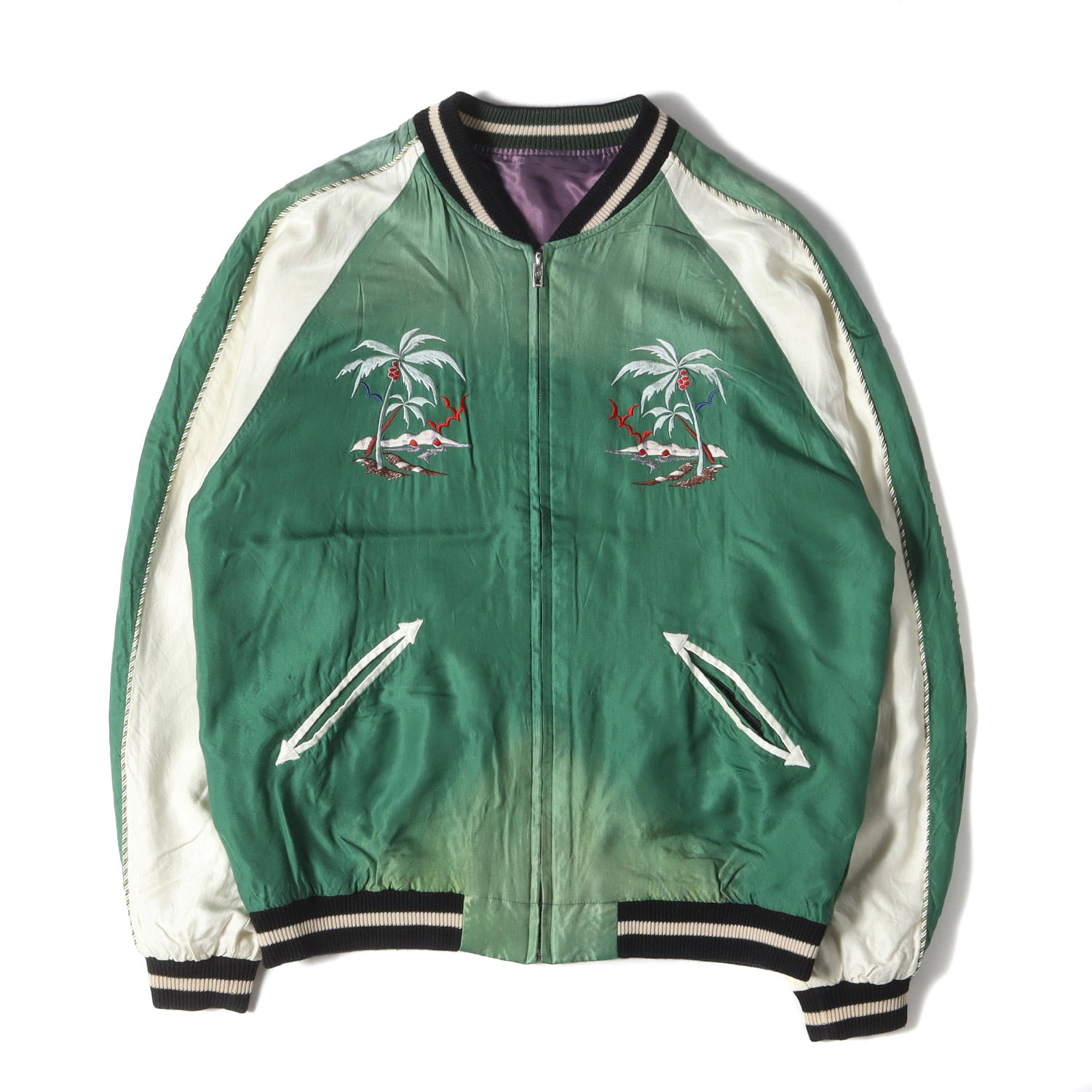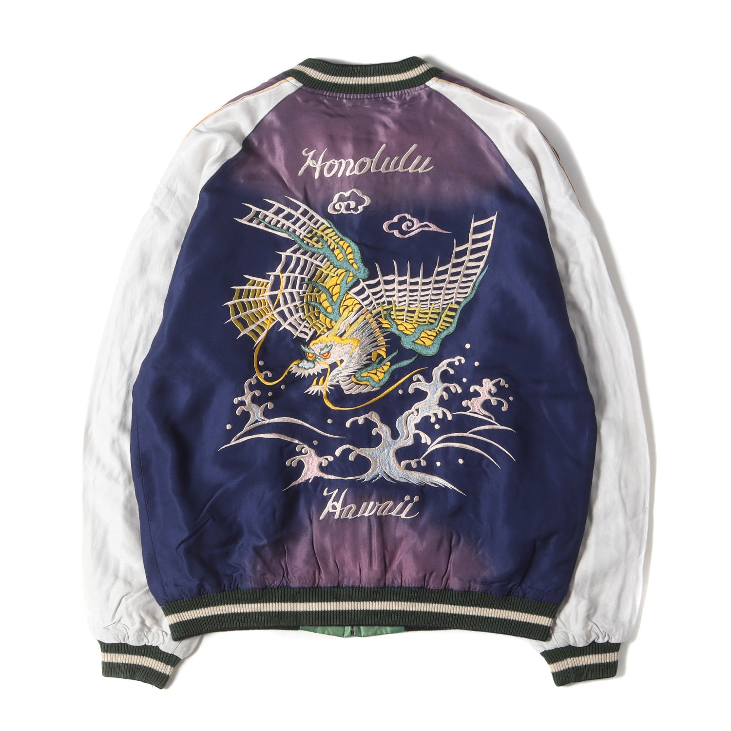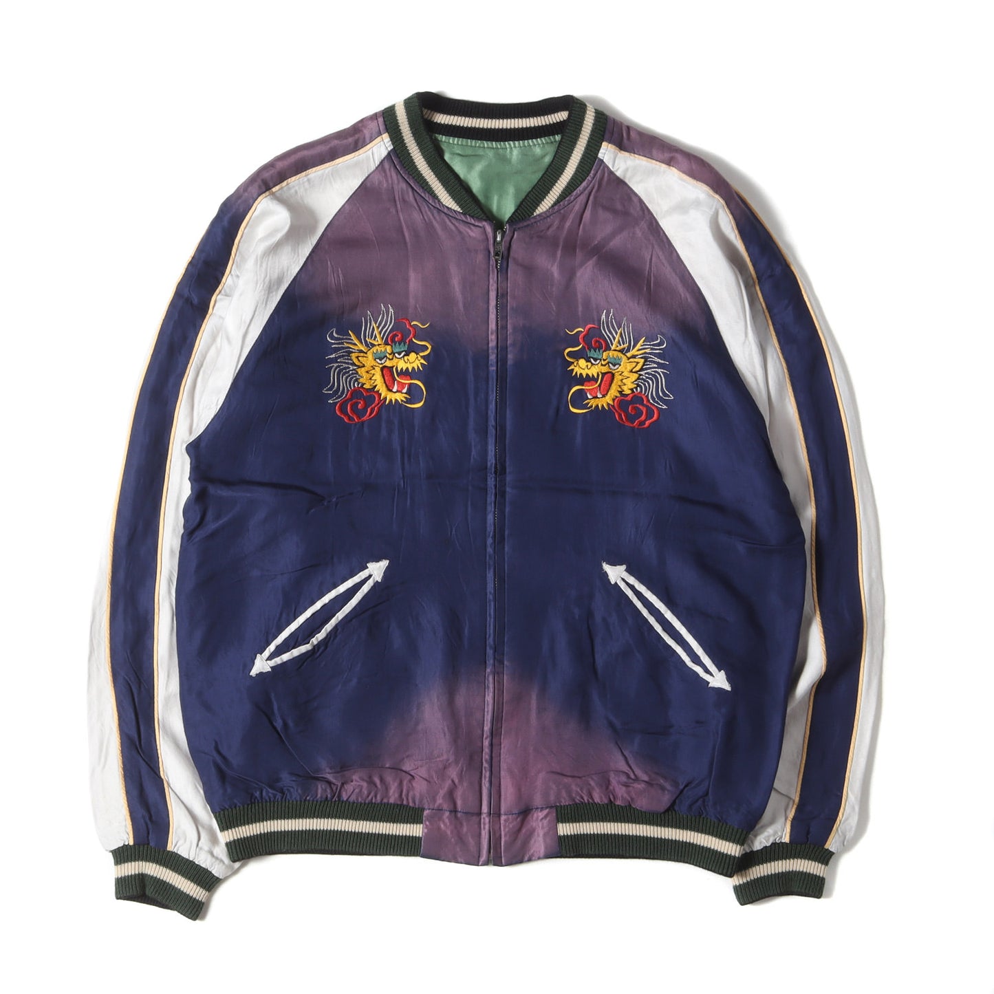 | 状態詳細 | ・ネイビー側の右ひじ付近、腹部に油シミ汚れがございます。 ・ネイビー側に後ろ右脇付近に糸引きがございます。 ・グリーン側の両袖先に多少の薄汚れがございます。 ・グリーン側の腰付近に多少の油シミ汚れがございます。 |